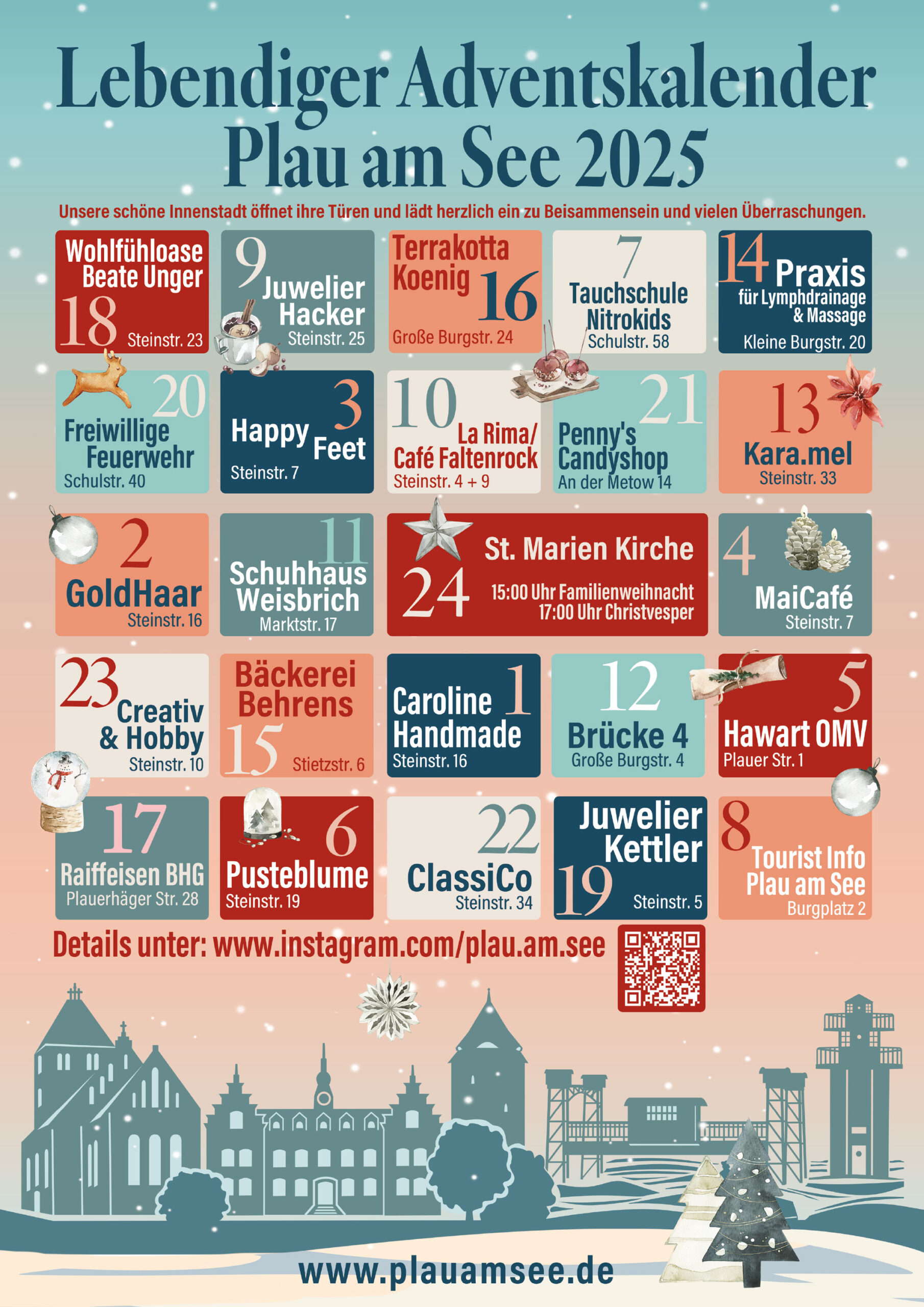 In der Vorweihnachtszeit lädt die Stadt Plau am See wieder zumlebendigen Adventskalender ein. Vom 01.12 bis zum 24.12 öffnen sich täglich besondere „Fenster“ an verschiedenen Geschäften, Einrichtungen und öffentlichen Plätzen in der Stadt – und das nicht nur im wörtlichen Sinne: Hinter jedem Türchen erwartet die Besucherinnen und Besucher ein kleines Programm voller Musik, Geschichten, Kunsthandwerk und weihnachtlicher Überraschungen.
