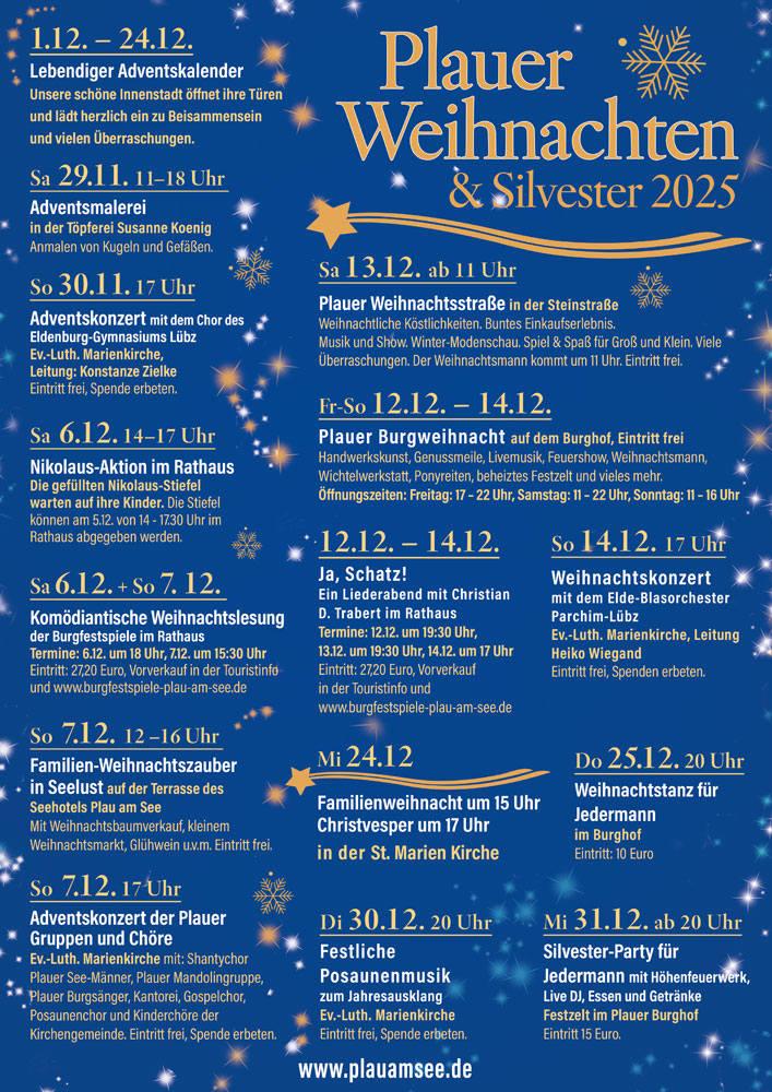 Die Veranstaltungshighlights sind auf dem offiziellen Plakat der Plauer Weihnacht zu finden und bieten einen Überblick über die vielfältigen Angebote in der Stadt. Ein Besuch lohnt sich in jedem Fall – ob zum Shoppen, Genießen oder einfach zum Festtagsflair erleben.